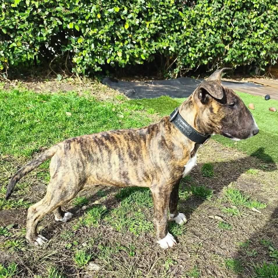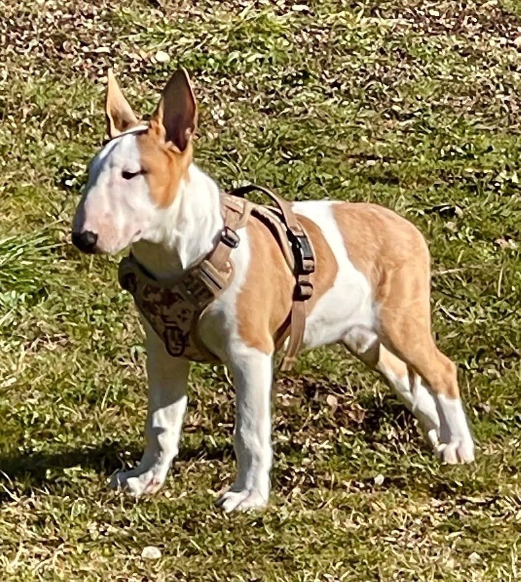 Aguilar est un mâle bringé à panachures blanches. Il a un beau collier blanc, les pattes avant toutes blanches et une petite tache sur le dos en forme de sourire. Son bringé est pour lui aussi bien dessiné. Photos à 2 mois. Pour l instant, comme Agénor, doux et curieux, il évolue bien au sein du groupe. Il restera en Occitanie, également dans une famille top, qui a déjà eu des Bulls et amoureuse de la race.